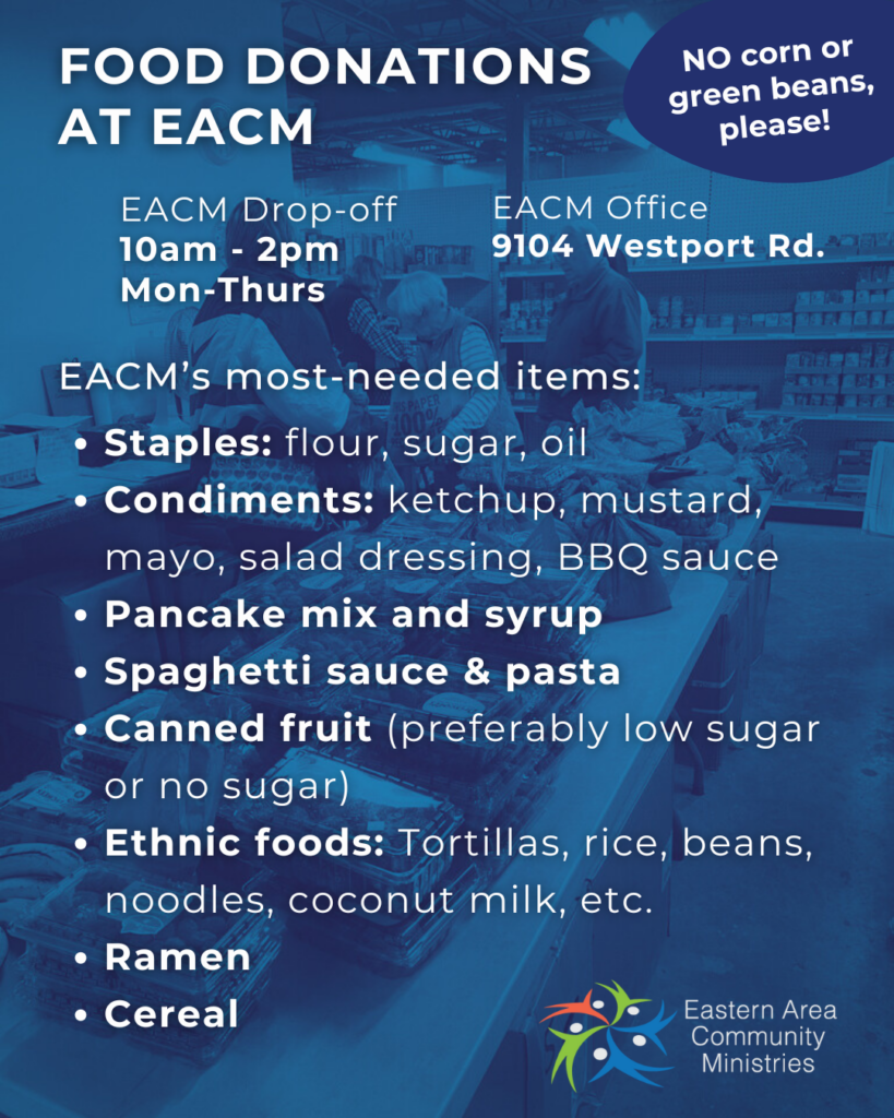 Last thought around food insecurity: EACM serves a lot of our neighbors who don't qualify for food stamps. Yet, housing, utility, auto, childcare, and food costs equate to more than the monthly income covers. Our pantry's inventory gets by pretty well in comparison to many others, but with an increased need from newly economically unstable households the scales will tip for us fast.
